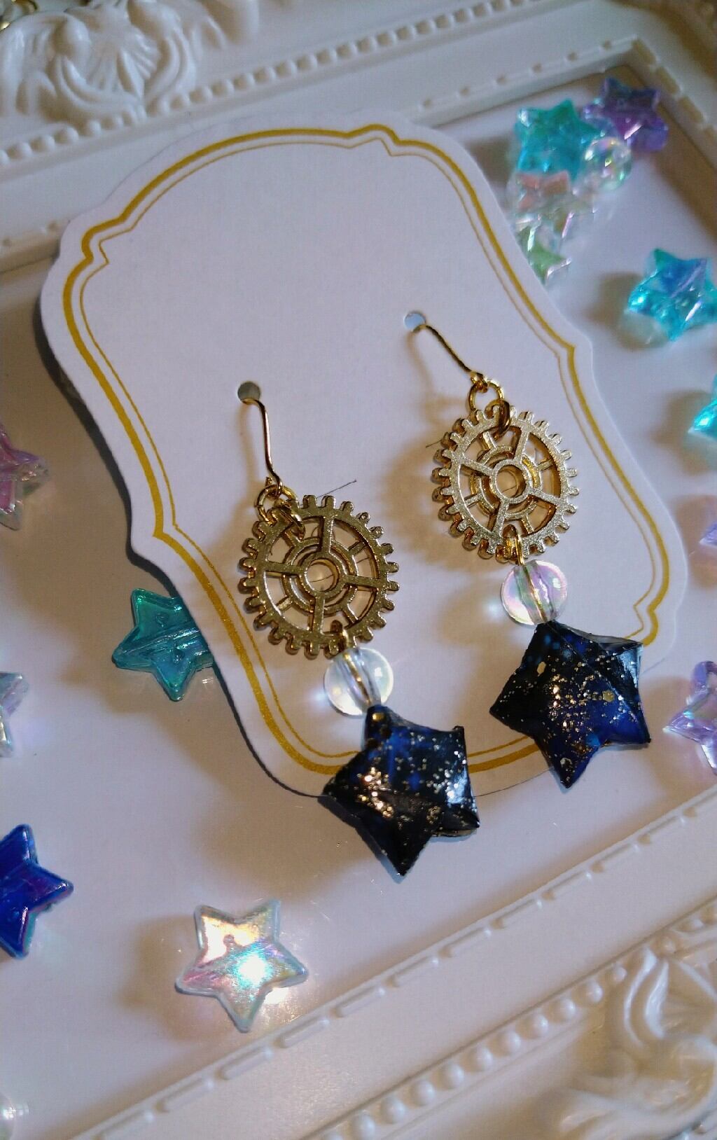 折り紙で作った星と歯車を組み合わせたピアスです。