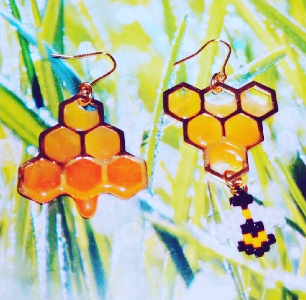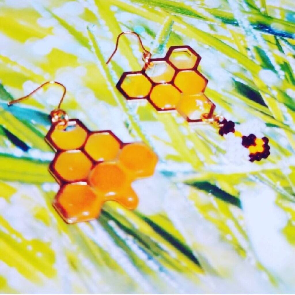 今にもこぼれ落ちそうなハチミツにつられてやって来たビーズのミツバチのピアスです。