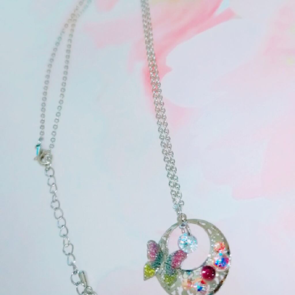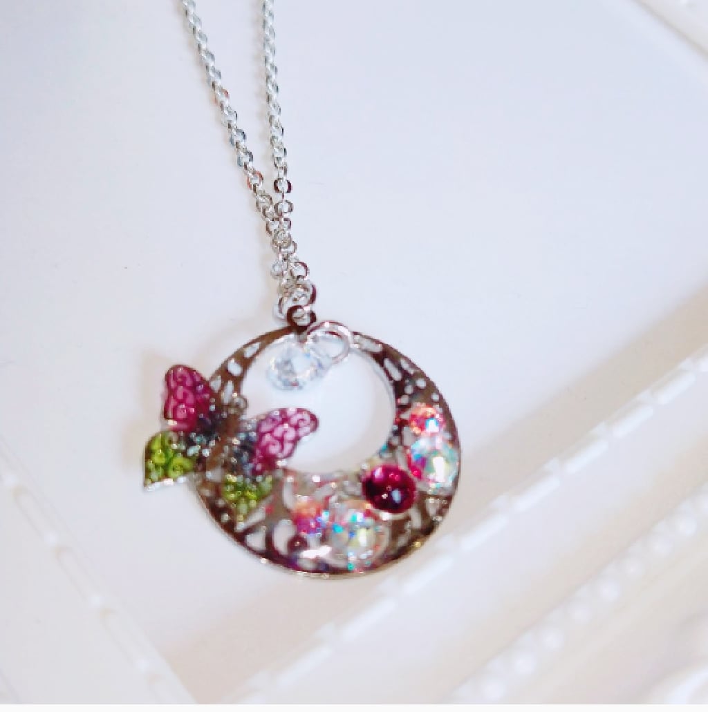 ピンク、青、みどりで色付けした蝶のチャームにスワロフスキーを添えて(*˘︶˘*).。*♡